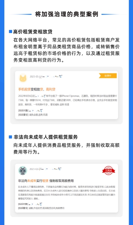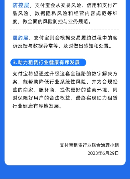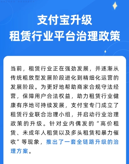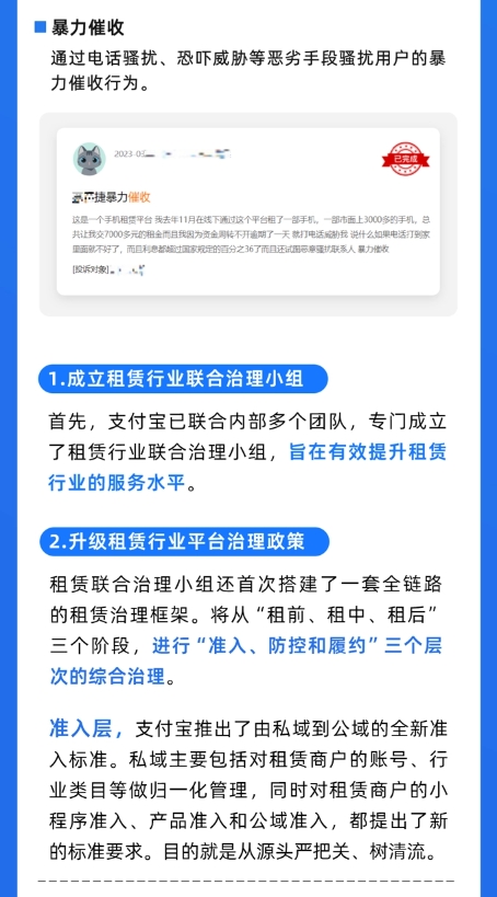 2023 年 7 月,支付寶更新發(fā)布《支付寶租享行業(yè)管理規范》,規定租賃商品年總租金和轉銷(xiāo)售金額之和不能高于商品官網(wǎng)價(jià)格的 130%。同年 6 月,支付寶還成立了租賃行業(yè)聯(lián)合治理小組,針對業(yè)內偶發(fā)的“高價(jià)租賃、未成年人租賃以及多頭租賃和暴力催收”等現象,推出了一套全鏈路升級的治理方案。官方稱(chēng)一旦發(fā)現商家違規行為,就立即要求商家進(jìn)行整改,并對小程序采取警告、搜索全局屏蔽等處置。