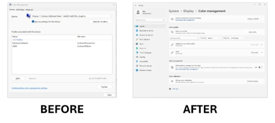 微軟在 Windows 11 24H2 中還計劃遷移“色彩管理”頁(yè)面,新版頁(yè)面替代了舊版“色彩管理”面板,讓用戶(hù)能更輕松地添加和刪除色彩配置文件。