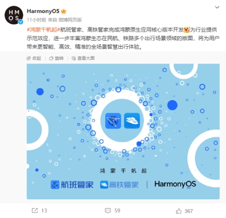 華為鴻蒙OS官微宣布,航班管家、高鐵管家完成鴻蒙原生應用核心版本開(kāi)發(fā)。