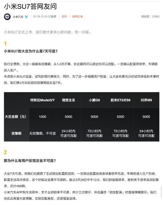 小米汽車(chē)官方回應“SU7 定金不可退”:鎖定配置意味鎖單完成,車(chē)輛將進(jìn)入生產(chǎn)階段