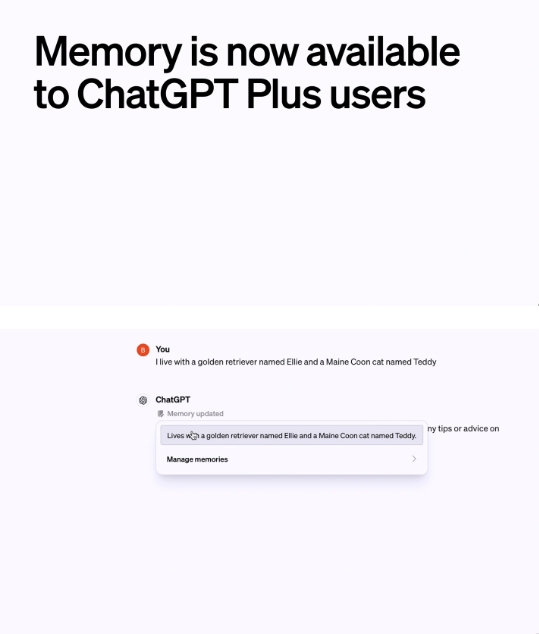 OpenAI 公司今天宣布,面向所有 ChatGPT Plus 用戶(hù)開(kāi)放“記憶”(Memory)功能,可以讓 ChatGPT 記住用戶(hù)在聊天中討論過(guò)的事情,并避免重復信息。