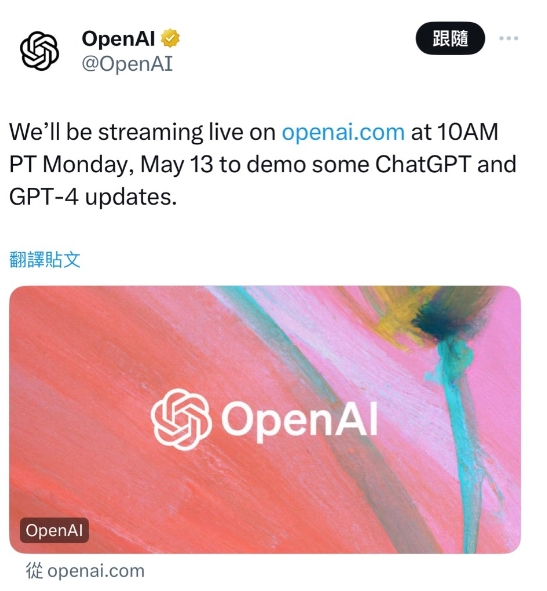 OpenAI 官宣 5 月 13 日直播演示 ChatGPT 更新內容