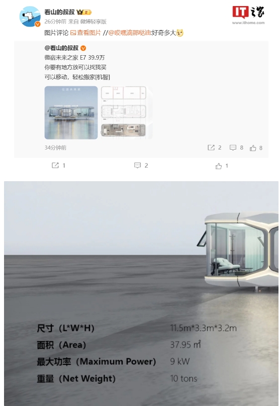 博主 @看山的叔叔 爆料,產(chǎn)品“微宿未來(lái)之家 E7”太空艙支持移動(dòng),售價(jià)在 39.9 萬(wàn)元,尺寸為 11.5×3.3×3.2m,面積 37.95m²,支持 9kW 最大功率,重量 10 噸。