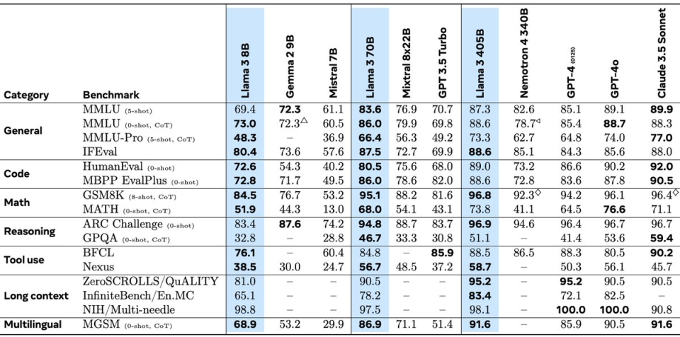 開(kāi)源大模型的“ChatGPT時(shí)刻”來(lái)臨!Meta發(fā)布最新AI大模型Llama 3.1,4050億參數版本在多項測試中性能均優(yōu)于GPT-4o