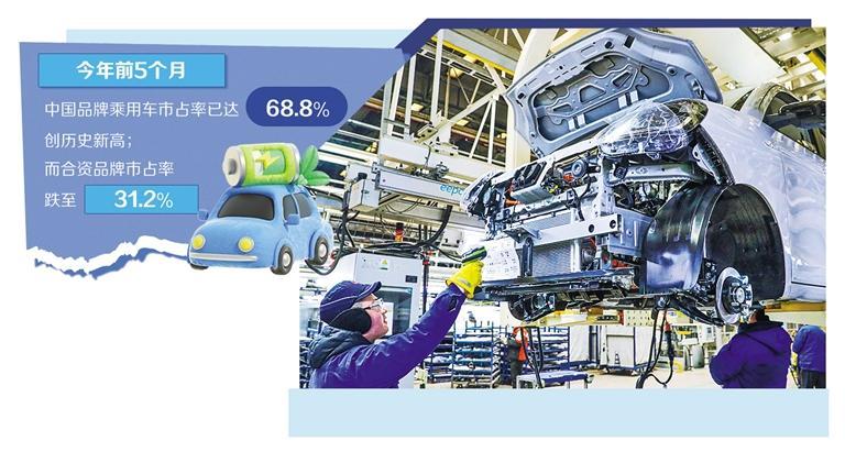 電動(dòng)化與智能化變革浪潮,不僅在加速汽車(chē)產(chǎn)品進(jìn)化,也在深刻重構市場(chǎng)競爭格局。中汽協(xié)數據顯示,今年前5個(gè)月,中國品牌乘用車(chē)市占率已達68.8%,創(chuàng )歷史新高;而合資品牌市占率跌至31.2%,創(chuàng )出新低。